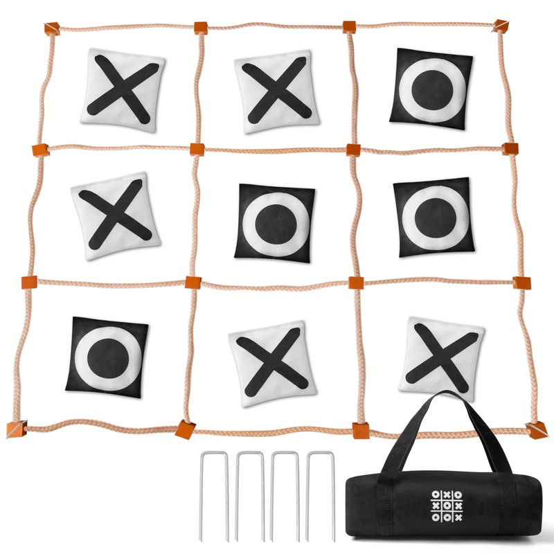 - [What You Get] You will receive a tic tac toe kit, which includes a classic portable wooden tic tac yoe strap,4 staples to hold the stakes in place, and 5 white X beanbags and 5 black O beanbags, in sufficient quantities which you can enjoy the game to your heart's content!