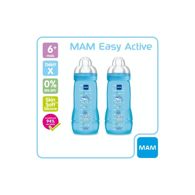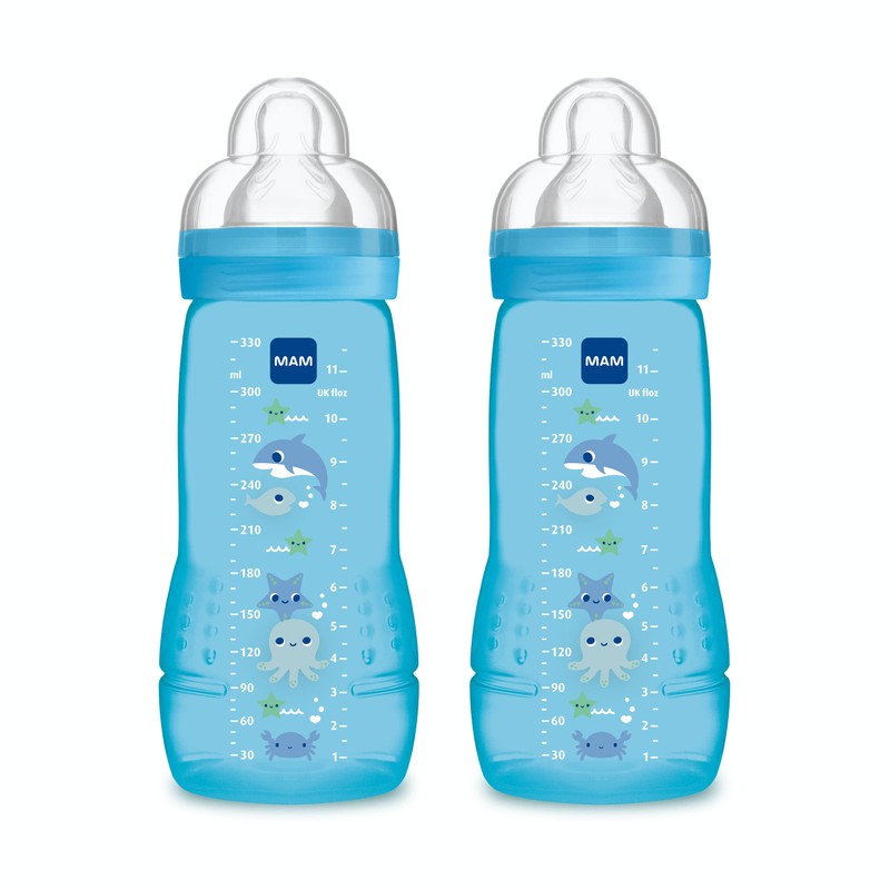 MAM Coloured 2nd Age 330ml Bottle 6 Months Debit Teat (Pack of 2)