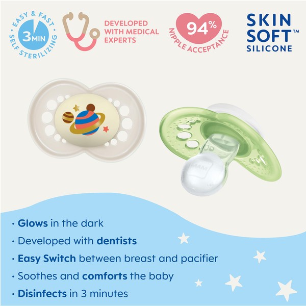 The buttons on these baby boy night pacifiers glow in the dark, making them easy to find at night. BPA/BPS-free MAM Night Pacifiers were developed by leading pediatric dentists and developmental psychologists to provide maximum comfort and style for babies age 6+ months.* Our orthodontic pacifiers for breastfed babies combine technological innovation and trendsetting design to help give babies a healthy start in life. The built-in air channel, naturally flattens and extends when sucked, mimicking a human nipple during breastfeeding. The symmetrical nipple fits perfectly in baby's mouth at any angle and life-like, SkinSoft textured silicone. With multiple pacifier shapes and nipple sizes to pick from, MAM nipples are easily accepted by babies of all ages, with 94% nipple acceptance among babies tested.** Silicone pacifiers kept in the closed self sterilizing case will remain clean for up to 48 hours: Fill case with water. Place pacifier in the sterilizing case with the nipple facing down. Follow package instructions for microwave setting. Cool completely before use. *Developed in conjunction with the International Children's Medical Research Society. **Market research 2010-2020, tested with 1,572 babies