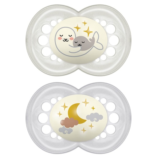 MAM Night Pacifiers (2 Pack, 1 Sterilizing Pacifier Case), MAM Pacifiers 6+ Months, Best Pacifier for Breastfed Babies, Glow in the Dark Pacifier, Baby Unisex Pacifiers(Design may vary)