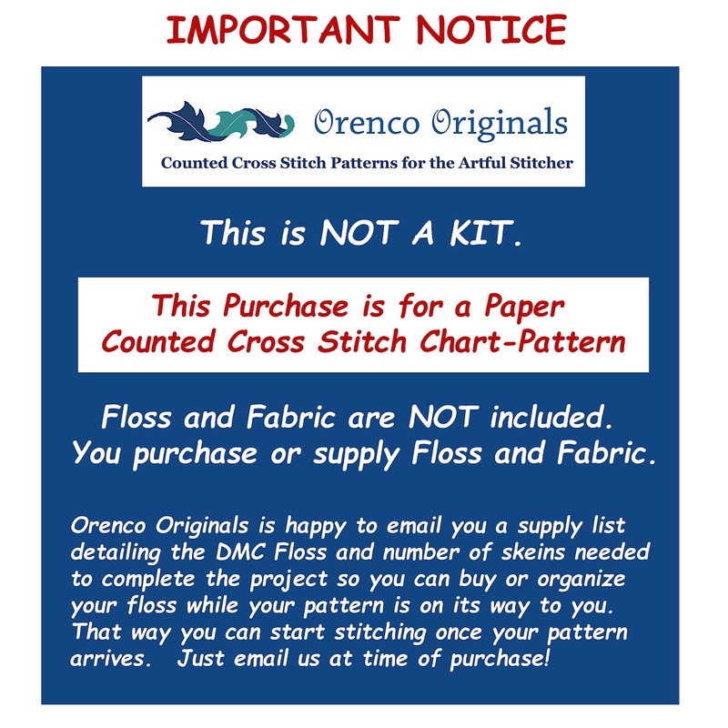 - Floss and Fabric are NOT included. This is NOT A KIT. This purchase is for a paper chart only. You must purchase Floss and Fabric separately.