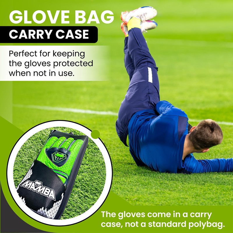 - Designed for ultimate comfort, durability and protection – experience the excellent quality of the MAMBA goalkeeper gloves with thick latex palm and backhand. High quality handmade with breathable fabric and double stitching. Market leading value for money!