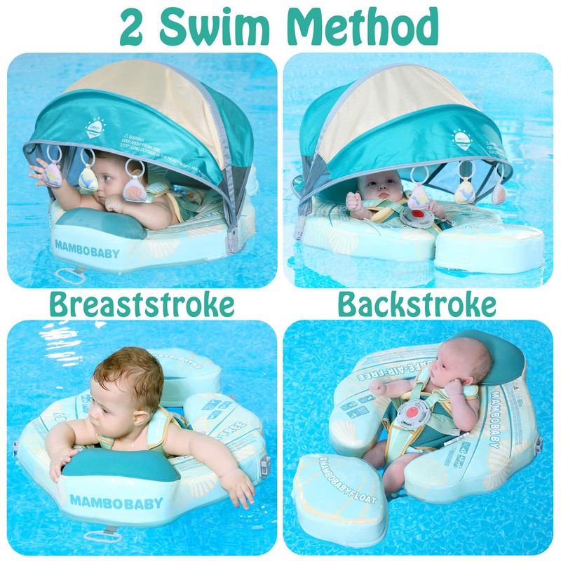 - 【360° FULL PROTECTION】Add removable tail, Prevent baby from flipping backward. Upgraded safety buckle, The Upgraded safety buckle provides 5 support points and perfect 40°angle to keep a balance to avoid baby flip over and fall off. Upgraded into 2 swim ways which are backstroke and breaststroke with different buckle method. Backstroke Suitable for 3~6months baby, breaststroke Suitable for 3~24months baby.