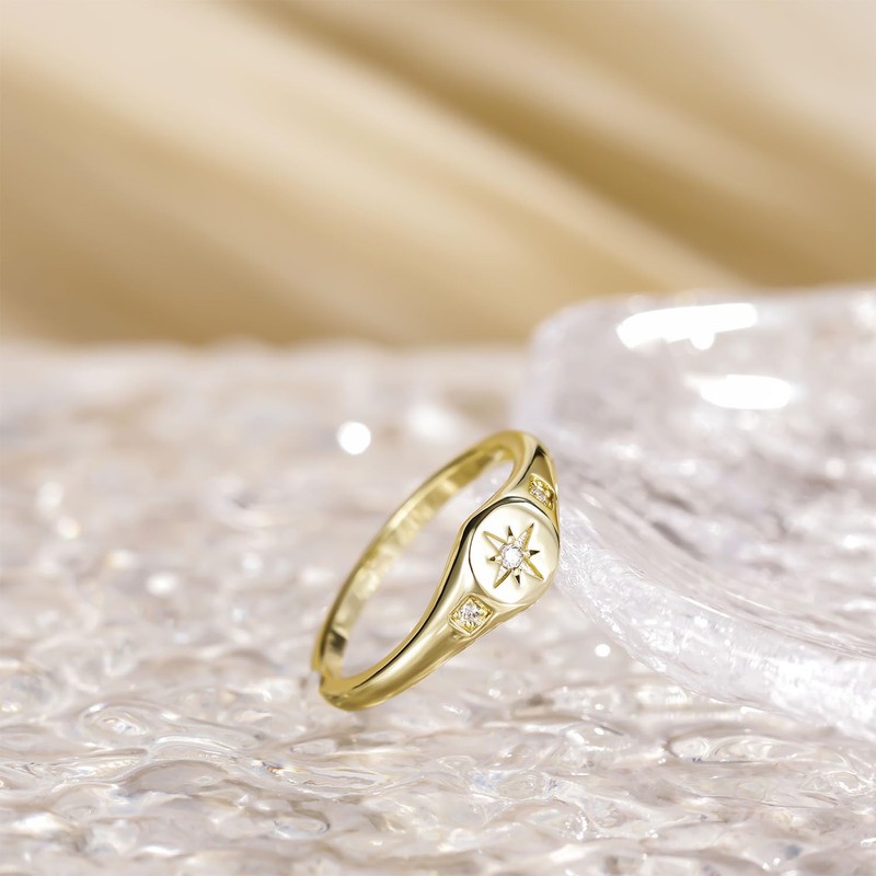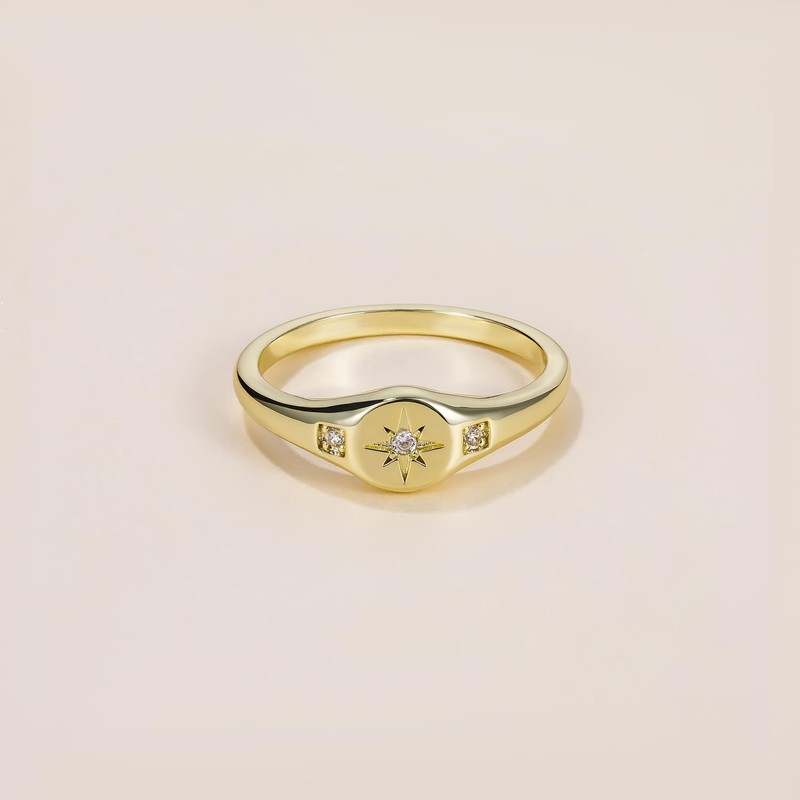 - Design: The starburst signet ring is a modern interpretation of the classic signet ring. An ode to tradition, the ring features an etched North Star in the centre, flanked with 2 tiny cubic zirconia crystals on the side. An everyday classic to add to your collection