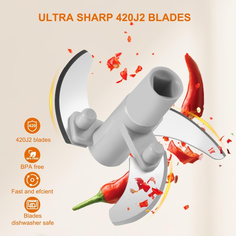 - 【Health & Safety】: The blades of garlic chopper are made from 420JS stainless steel and will not bend or rust. The three blades are arranged in different directions and heights to ensure that all the ingredients can be chop evenly.