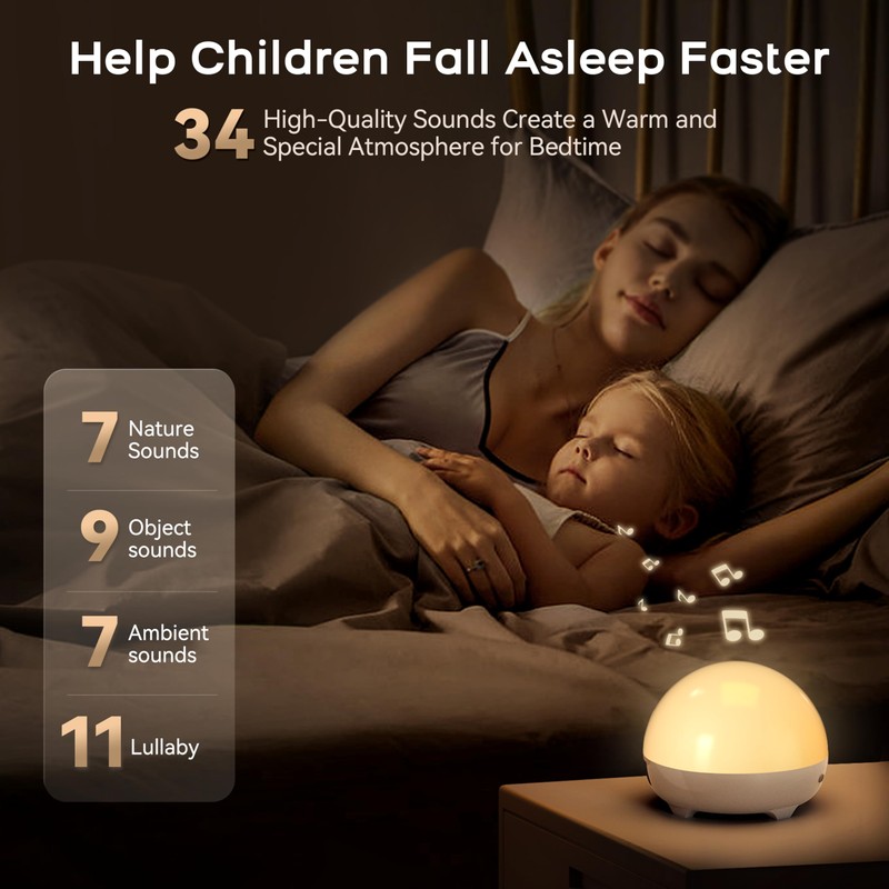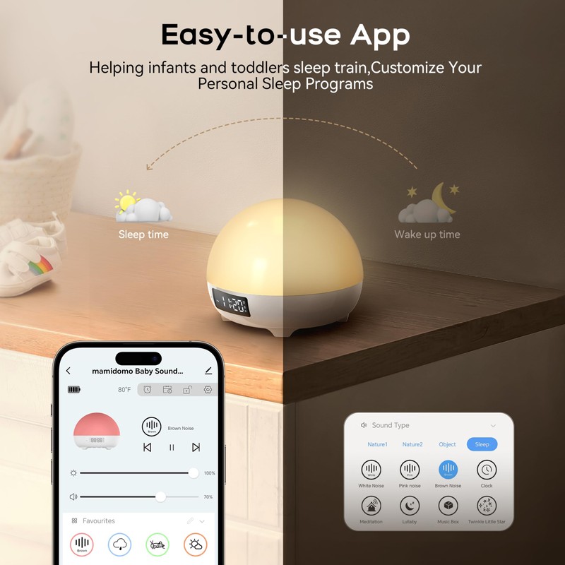 Why choose our MAMIDOMO Baby White Noise Machine? Choose our nursery night lights to make your baby's night more peaceful and make your parenting life easier. The MAMIDOMO Baby White Noise Machine, designed by sleep experts, is your ideal partner in establishing a healthy sleep routine for your baby. It features a wake-up and bedtime alarm clock along with three daylight modes that simulate sunrise, afternoon, and sunset, along with adjustable colors and sounds, helping your baby develop a natural sleep pattern, promoting healthy growth and development. Our baby sound machine offers 34 high-fidelity sounds, carefully chosen by sleep specialists. These include white noise, pink noise, brown noise, natural sounds, ocean waves, fan sounds, rain, womb sounds, shushing, and lullabies. These sounds ensure your baby sleeps soundly through the night, soothe crying, aid relaxation, and are perfect for travel. The MAMIDOMO nursery night light features anti-blue light LED technology, providing a soft, eye-friendly glow. With multiple adjustable lighting options, it perfectly illuminates the crib and changing table, making nighttime feedings easier and more comfortable. Control the MAMIDOMO Baby White Noise Machine effortlessly through the app or manual buttons. Adjust sounds and lights anytime, anywhere, without getting up. Note that this baby sound machine requires a 2.4G Wi-Fi network for app control. 5G Wi-Fi network not supported. The MAMIDOMO baby sound machine is more than just a sleep aid. It includes multiple alarm clock settings via the app, helping you manage feeding times and other routines precisely. The built-in room temperature monitor ensures a comfortable environment, helping your baby fall asleep, stay asleep, and wake up refreshed. With a built-in rechargeable battery that lasts up to 8 hours, the MAMIDOMO machine is perfect for outdoor use. It fits easily into a stroller, car seat, or suitcase, making it ideal for road trips, walks, hotel trips, and business travel. Product Details:Size: 5.1in*5.1in*5.3in Customer Service: Our white noise machine not only optimizes your baby's sleep routine, but also giving you years of peace of mind.
