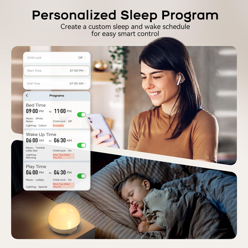 • [Customizable Settings for Personalized Experience] Tailor settings to adapt to your preferences with the free app where you can effortlessly adjust the device's RGB color across a wide range of hues and 100 brightness levels. Customize sound and volume settings to suit your needs. Utilize the preset scene modes or create your own, with the freedom to save up to 8 custom configurations.