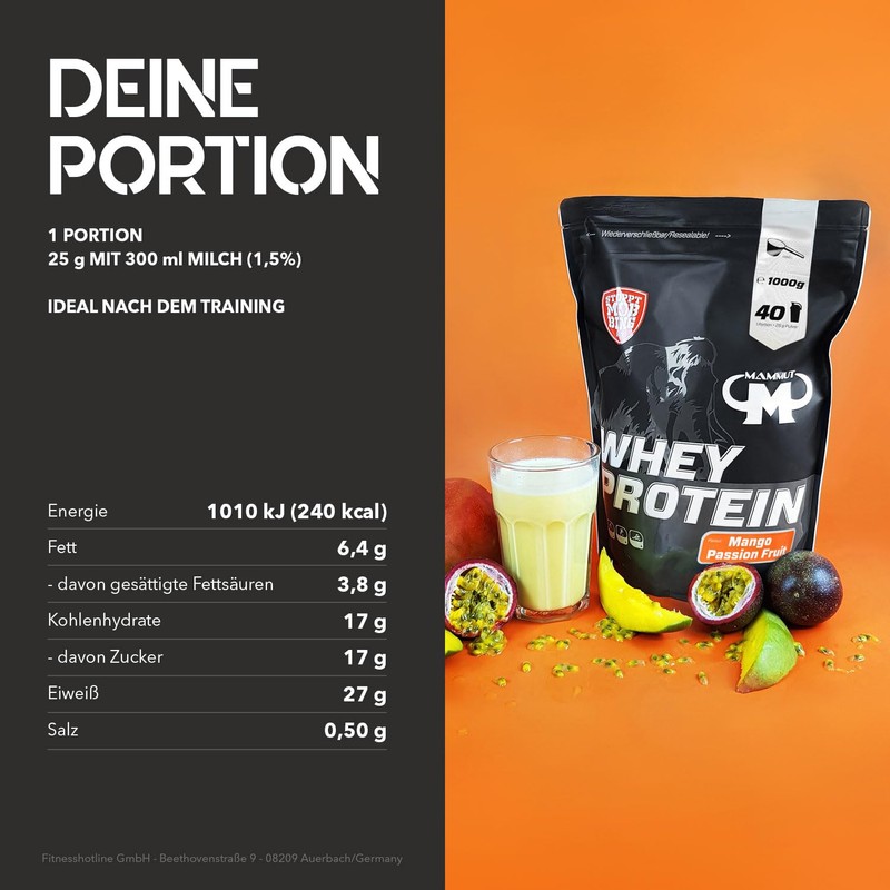 Mammut Nutrition Mammut Nutrition Whey Protein Pulver Mango Passion Fruit – 1kg – 27g Protein pro Portion – Eiweißpulver mit hohem BCAA-Anteil – Perfekte Löslichkeit in Wasser & Milch – Ideale Zwischenmahlzeit