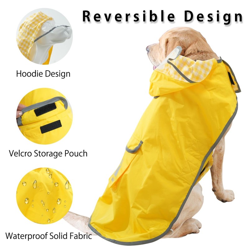 - REVERSIBLE DESIGN: The reversible stylish slicker poncho can easily transform from solid color raincoat to plaid fabric jacket. Outer layer with strong waterproof ability material, inner with ultra breathable soft plaid fabric. Flip over dog rain gear and get a new look.