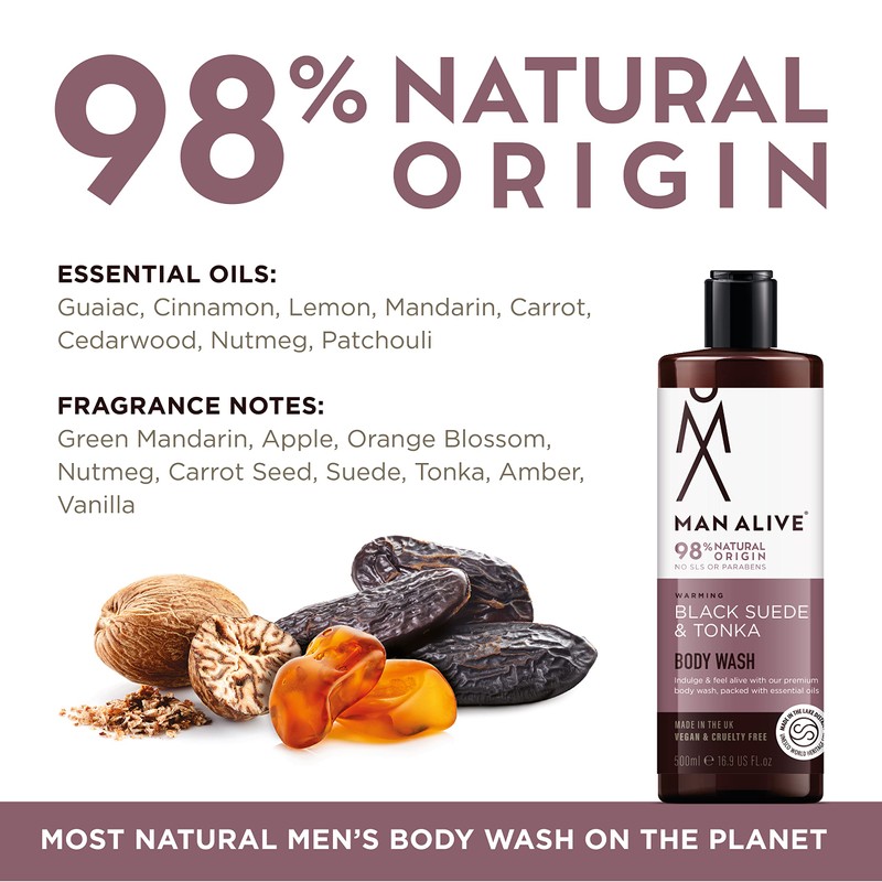 MAN ALIVE MAN ALIVE Shower Gel for men, 500ml mens body wash & face wash contains a masculine scent, Vegan, SLS Free & sulfate free formula. ideal mens grooming gifts for men (Black Suede & Tonka, Single)