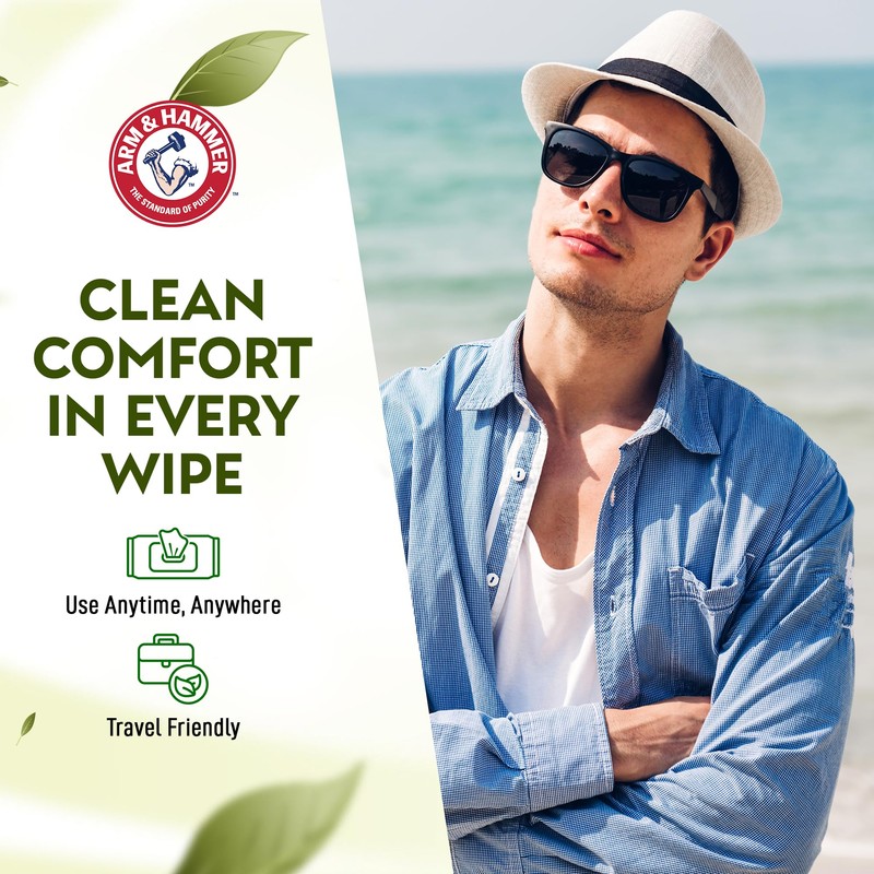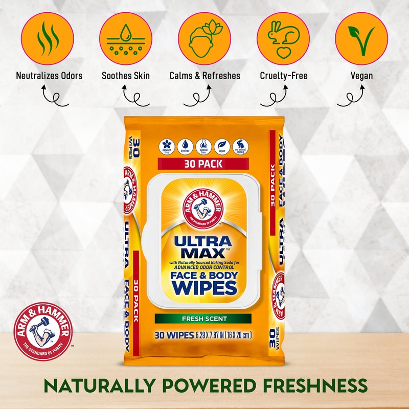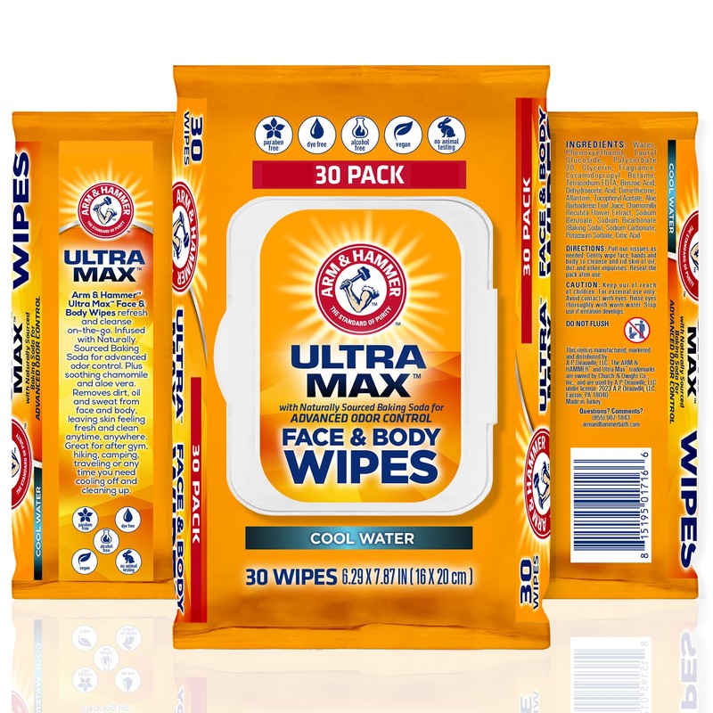 Arm and Hammer Face and Body Wipes for Adults - Deodorant Towelettes 30 Wipes for Men - Shower Sheets for Traveling, Camping, Gym, and Bathing - Alcohol-Free Face Sheets (Cool Water)
