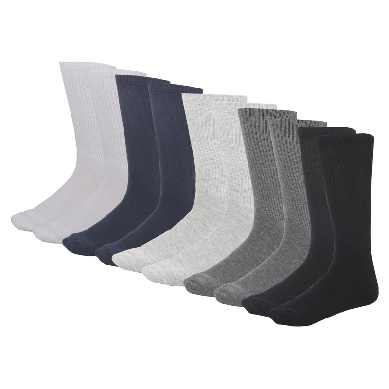 - Fine Crew Socks premium super soft cotton with stretch for comfort, reinforced double layer cushioned. Pack of 5. White, Navy Blue, Light Grey, Dark Grey, Black. Heel to Toe Size 8" inches. Leg to Heel Size 8.75" inches.