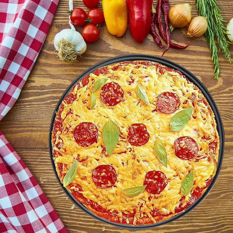 - 【HIGH-QUALITY MATERIAL】 Made of high-quality carbon steel, the pizza baking pan is strong and durable, not easy to break and deform. Compared with baking pans made of silicone or plastic, our round pizza pans are superior.