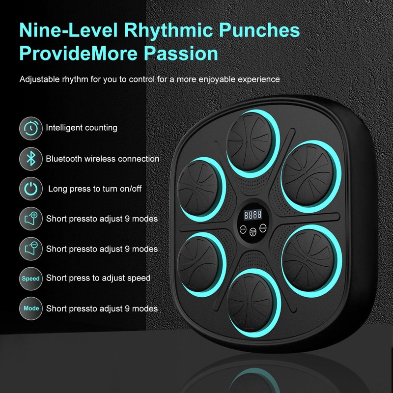 - [2025 Upgraded] Immersive Music Boxing Trainer Wirelessly connect your phone to stream beloved music. LED lights pulsate in sync with the beat, accompanied by stereo surround sound. Customize light jump speeds across 1-9 levels. Enhanced impact pad suits beginners to pros.