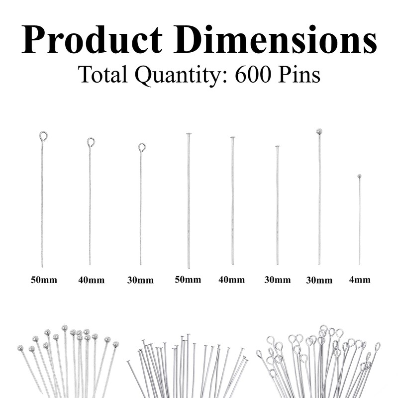 - Eye pins for jewelry making bulk assortment; 8 assorted pin styles; Quantity: 600 PCS; 30mm and 40mm eye pin and head pin: 100 PCs each size: 50mm eye pin and head pin: 50 pcs; 30mm and 40mm ball head pins: 50 pcs each Size; Wire Gauge: 22 gauge or 0.64mm