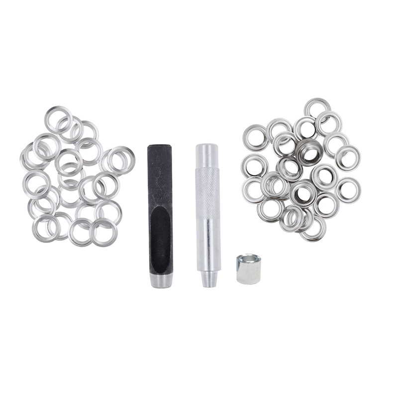 It can easily replace eyelets in shower curtains, backdrops, shades, tapestries, drapes, or hammocks. These circular chrome grommets add a professional quality touch to golf towels, dog collars, key fobs, wallets, holsters, tags, linen napkins, quiet books and much more. These weather-resistant grommets are suitable for outdoor use and will hold up well as eyelets in tents, flags, frost blankets, or bike frame bags.