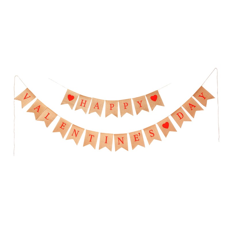 - Valentines banner made from natural jute burlap; Durable and sturdy Valentines day decoration; Handmade valentines garland; Pre-strung and no DIY assembly needed; Will not fray or shed; Fit for both indoor and outdoor uses; Odorless valentine banner