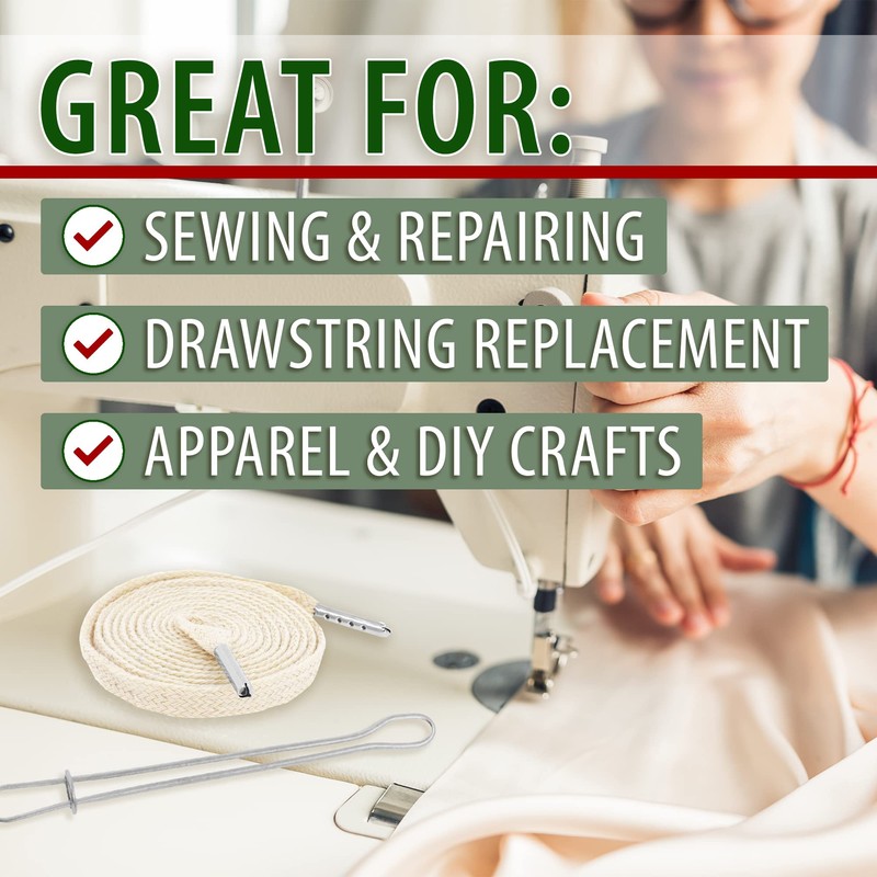 - Bulk Cord Sewing Drawstring Roll: The continuous mint flat cotton drawstring replacement with consistent width is measured 3/16 inch or 5mm wide and 20 yards long.