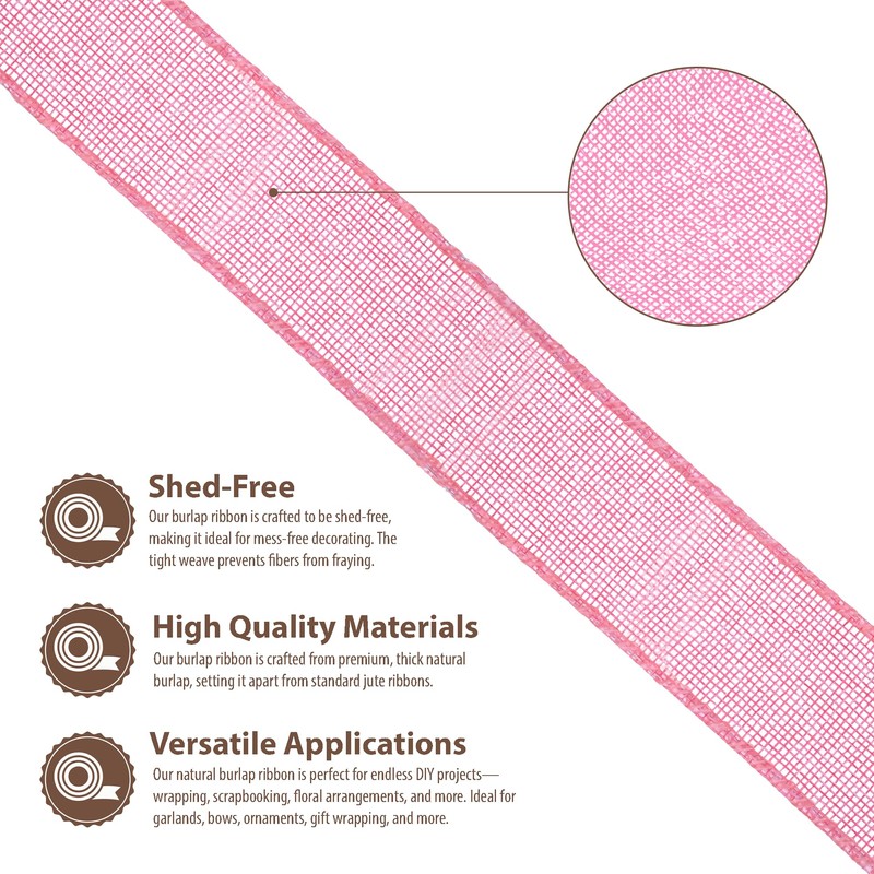- Natural Burlap Ribbon: Compared to other jute burlap ribbons, our rustic burlaps ribbon with a fray & shed-resistant hemmed edges is made from thicker pink burlap fabric. The indoor & outdoor colored burlap crafts ribbon is colorfast and will not bleed.