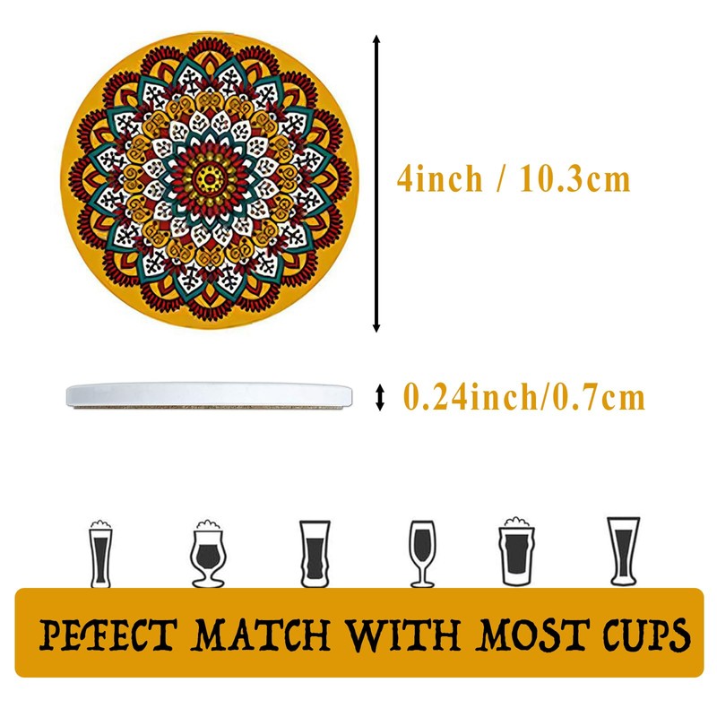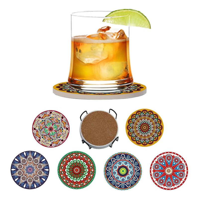 Mandala Drink Coasters with Holder, Set of 6 Ceramic Stone Absorbent with Cork Base for Table Protection, 4 Inch Round Fit for All Kinds of Cups and Mugs