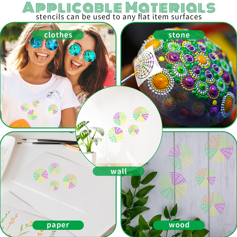 - Wide application: the mandala dot painting tool template is suitable for stone, wood, floor, wall, furniture, canvas, gift box, canvas, fabric, notebook, scrapbook, etc. Painting template suitable for birthday, Christmas, Halloween and holiday party decorations. Mandala stencil large create beautiful works of art and bring more fun to your life.