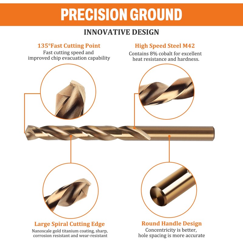 - Enhanced M42 Alloy Material:Industry grade M42 carbide drill bits, much harder than HSS used in other similar drill bits set. These drill bits contain 8% Cobalt, which increases wear-resistance and durability.
