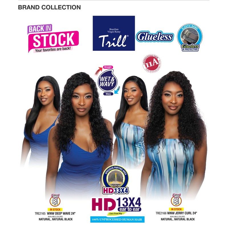 Mane Concept Trill Unprocessed Human Hair HD Lace Front Wig Glueless 13X4 Wet N Wavy TRE2166 WNW Jerry Curl 24" (NATURAL BLACK)