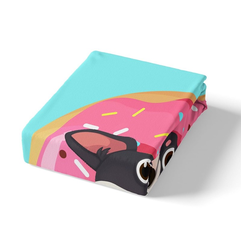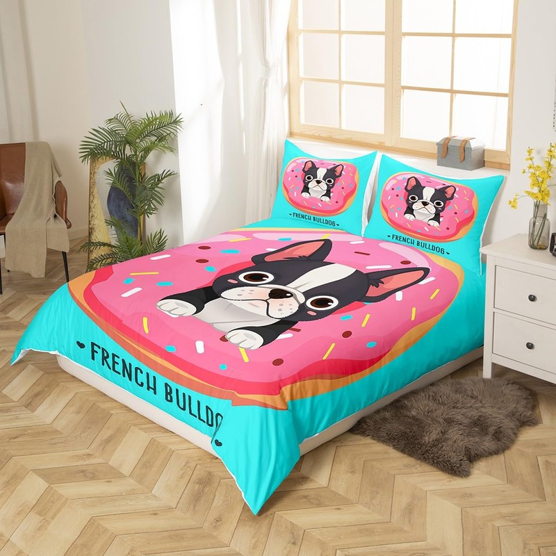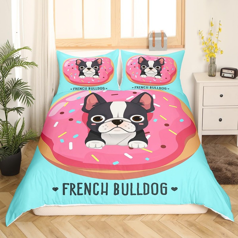 Manfei Cute Dog Comforter Cover Set French Bulldog Puppy with Sweet Pink Donut Duvet Cover Animal Bedding Set 2pcs for Kids Soft Polyester Quilt Cover with 1 Pillow Case(No Comforter) Twin Size
