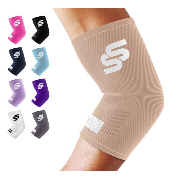 Manga de compresión para codo de estrellas para mujeres y hombres, codo para dolor y artritis, codo de tenista, tendinitis y brazo de tenista, protector de codo para golf y otros deportes (S-XXL) (M: 8.5-10 pulgadas, beige)