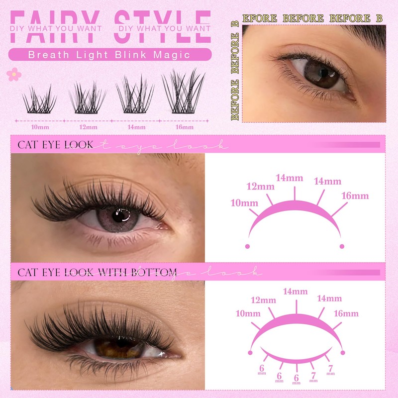• Fairy Eyelash Clusters with Bottom Lash:This Fairy vibe lash clusters kit includes 180Pcs Natural individual lashes 10-16mm mixed length upper lashes and 6-7mm bottom lashes, diy variety looks by yourself at home; Easy get salon-like lash extension