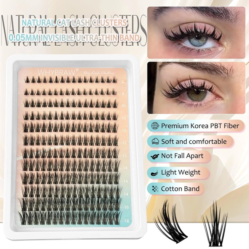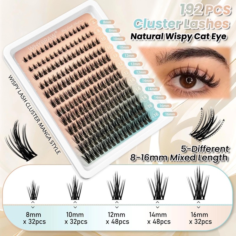 - Manga Lash Styles, Create Any Lash Look You Want: WHYBRAW lash clusters offer ultimate flexibility! Whether you’re going for a sultry cat-eye, doll-like rounded lashes, or a natural everyday look, you can mix and match them like building blocks. The winged outer-corner effect adds sophistication, while dense lower lashes amplify your eyes—all achieved with just one kit.