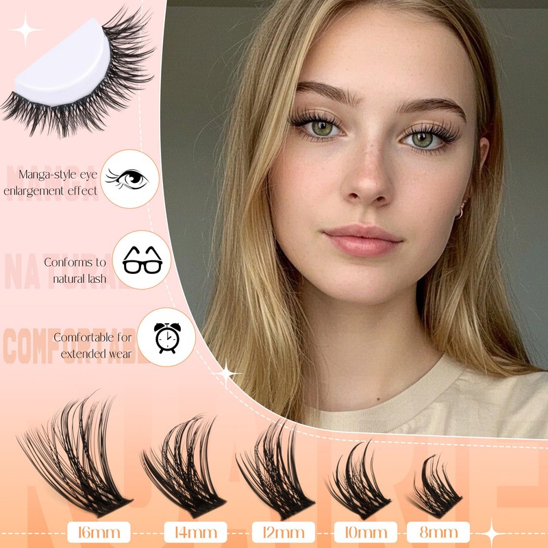 - 3.Creating Versatile Style Lash Clusters: 144 clusters of 8-16mm false lash clusters combined with 36pcs of 5-6mm bottom lashes double the eye-enlarging effect. Through mixing and matching different length lash clusters, it easily achieves professional-grade cluster lash extension effects in various styles.