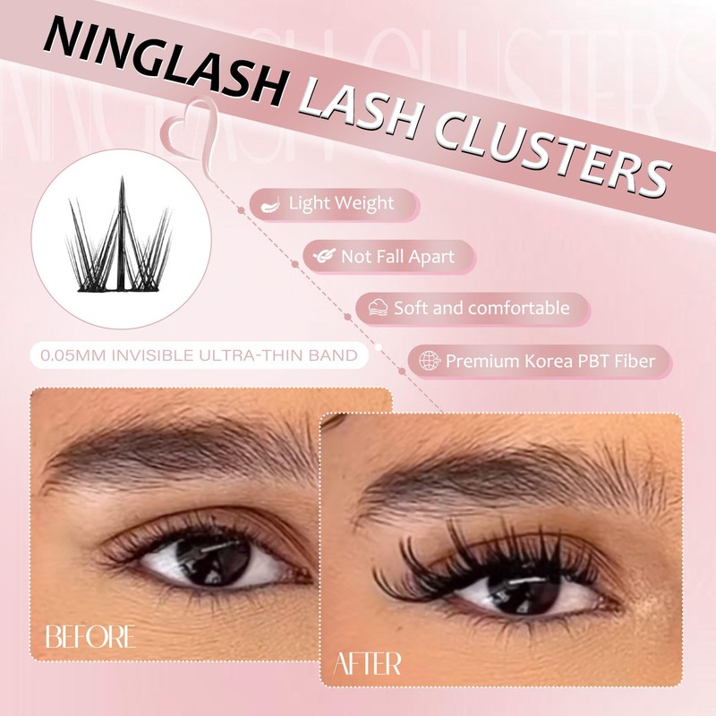 - 4th Generation DIY Lash Clusters – Ultra-Thin, Clear Band: Featuring an upgraded ultra-thin transparent band, these lashes are stronger and more flexible, reducing the risk of breakage. Once applied, they feel as light as feathers, providing ultimate comfort and a seamless natural look.