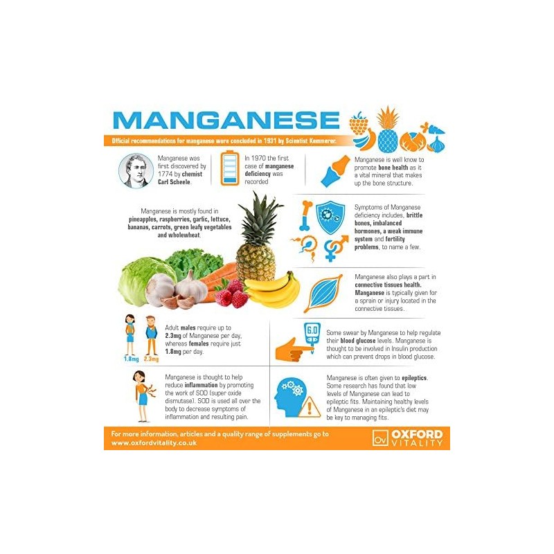 Oxford Vitality 14 mg Manganese Supplement is also used by the body for the normal formation of tissue connections including cartilage. An distinctive supplement for use in conjunction with glucosamine and chondroitin for the development and maintenance of bone health. Manganese helps to reduce oxidative stress which protects the cell's integrity and reduces disease. Available in 120 tablets pouch.