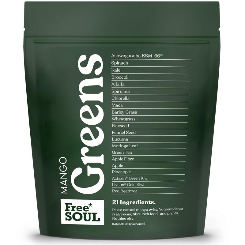 Free Soul Greens, with a natural mango twist. 21 natural and nutrient-dense greens & superfoods in one convenient daily teaspoon. Support your immunity, energy, and digestion with continued and consistent use.
