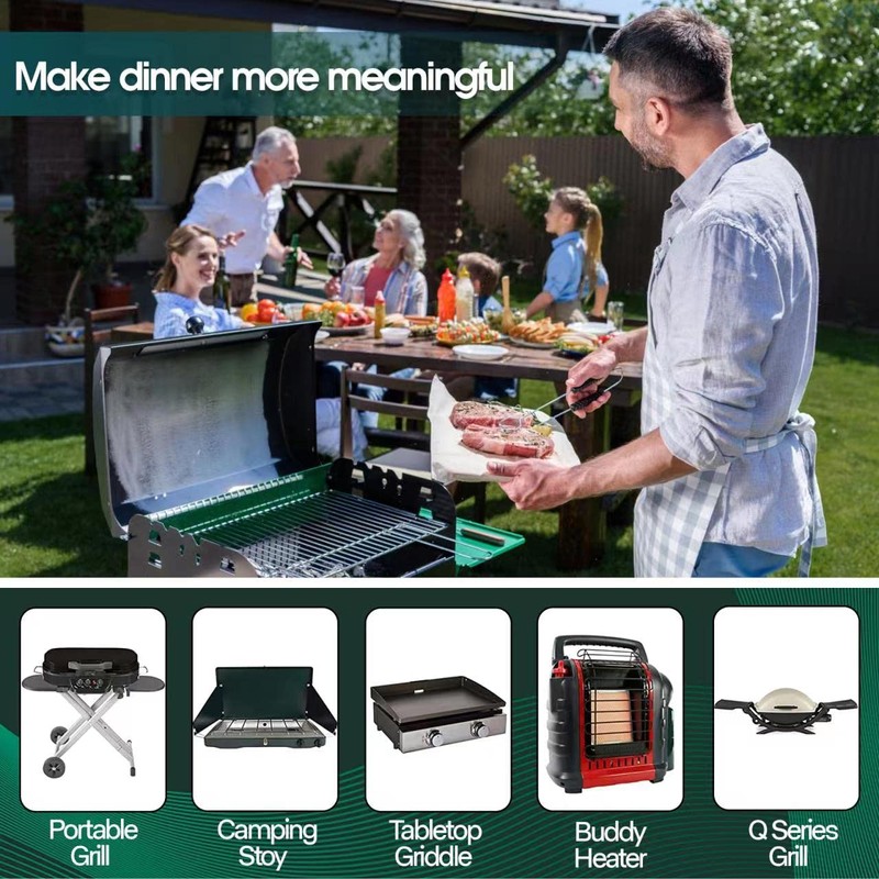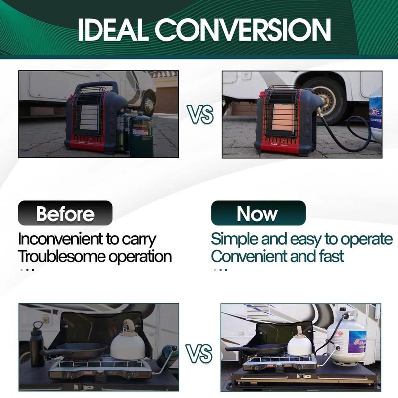 - Conversión ideal: la manguera convertidor de propano KOMAN es ideal para aparatos portátiles de 1 libra que se conectan a tanques de propano de 5 a 40 libras. Nuestra manguera adaptador de tanque de propano es ideal para estufas de campamento de propano de 1 libra, parrillas de mesa/portátiles, parrillas Weber Q, parrillas de computadora Blackstone, calentador Buddy y parrillas portátiles Coleman. Asegúrate de que tu aparato de propano de 1 libra se pueda conectar al conector CGA600 antes de comprar
