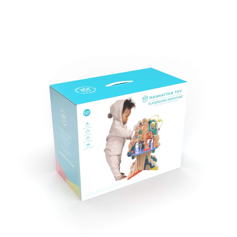 Playground-themed fun all in one wood activity center! Discover four quadrants packed full of playful activities including 20 gliders on seven different tracks, an abacus track, five beads runs, two spinners, a springy bear riding a dinosaur and more! Plus, this delightful activity center is covered in playground-themed illustrations that bring the fun of the playground inside. Encourages cause and effect learning and motor skill development. Adult assembly required - hardware included. The Playground Adventure offers seated and kneeling play for young toddlers. Although hefty in construction, it is not designed to provide standing or pull-up support. Standing play is recommended for children able to stand unassisted. Since 1978, Manhattan Toy has been making award-winning, high quality, educational toys for your baby, toddler or kid. From baby toys and toddler toys to wooden toys and activity centers, our goal is to provide the safest and best toys available. All of our products, from the newest concepts to our time-tested classics, are innovatively designed to inspire imaginative play.
