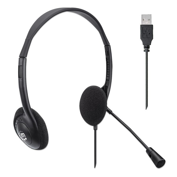MANHATTAN USB Headset with Mic & Long 5 ft Cable - Dual-Sided Padded On-Ear, Adjustable Headband - for Desktop, Laptop, Computer – 3 Yr Mfg Warranty - 179461