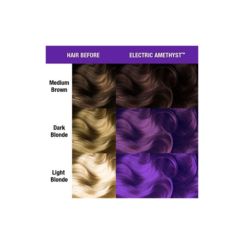 - Electric Amethyst Hair Dye Color; A Glowing Medium Violet Hair Dye With Cool Blueish Undertones; For Best Results We Recommend Lightening Hair To The Lightest Level Ten Blonde Before Use