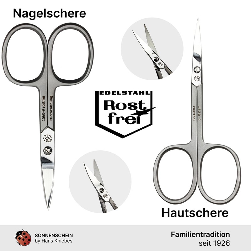 Our brand Sonnenschein is a part of our third generation family business founded in 1926 and impresses with high-quality and high-quality anti-allergic nail care instruments. These are manufactured to the highest quality standards and parts hand-sanded in our factory. Likewise, our selected range is complemented by inexpensive manicure cases with high-quality genuine leather or faux leather cases, which score points with practical instrument selection and timeless designs among satisfied customers. The high-quality double-sided nail files are used for precise shortening, shaping and smoothing of the nail. The comfortable length makes it easy to use and ensures a neat and professional manicure both at home and in the nail salon. To prevent nail split ends, the file should always be applied only in one direction and held slightly tilted. For a particularly beautiful result with smooth and shiny fingernails completely naturally without chemical substances, we recommend these steps: In the first step, remove all bumps and grooves with the pink file surface. In the second step, the white polishing surface gives the nail a matte shine. In the third and final step, you can then give the nail with the grey surface the desired degree of shine. Our tip: rinse the polishing file briefly under clear water after each use. and then leave them and then leave them. Dry thoroughly!