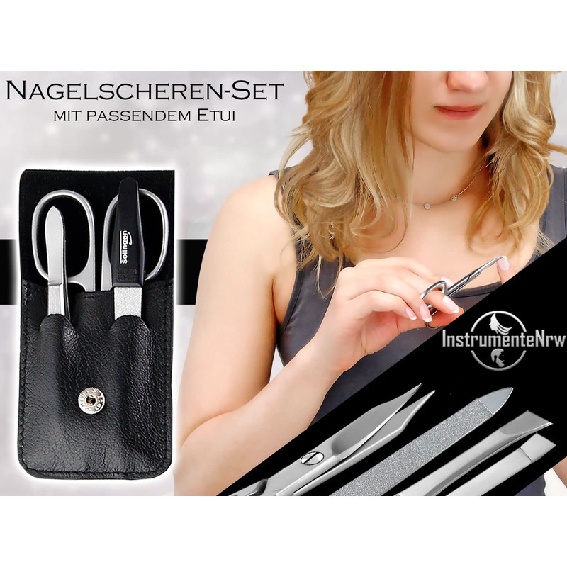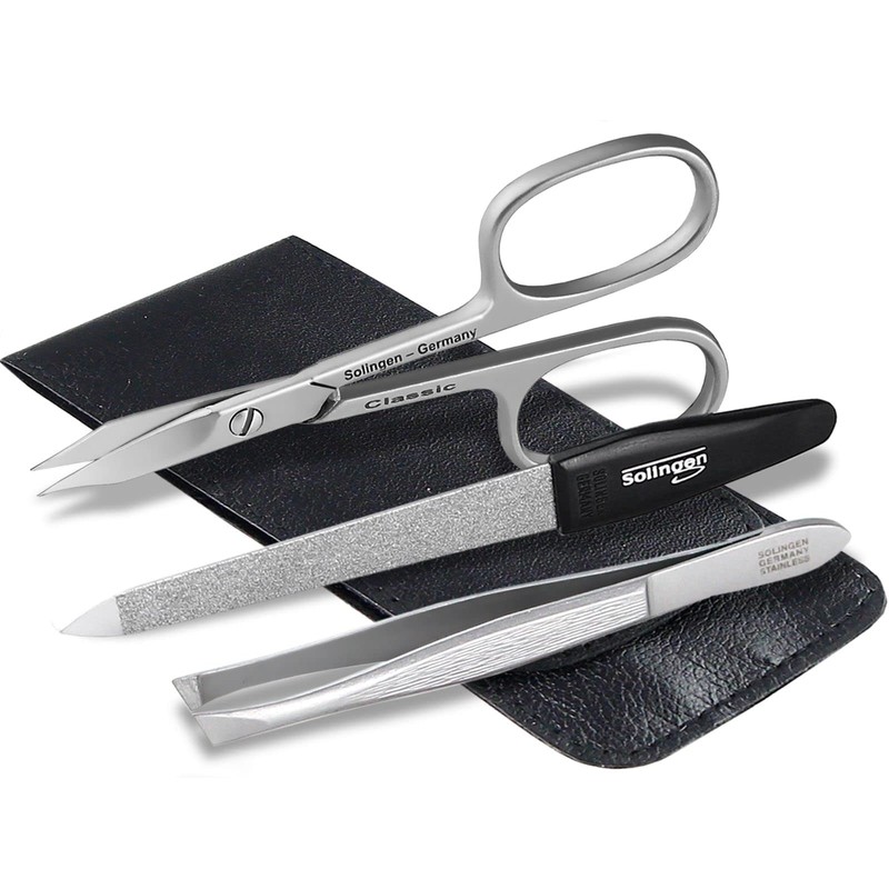 - Solinger design: high-quality manicure case from Solingen. Made in Germany. The 3-piece set consists of a nail scissors, nail files and tweezers. Perfect for travelling. The case is made of genuine leather and ensures a firm hold of the instruments, and is also a real eye-catcher.