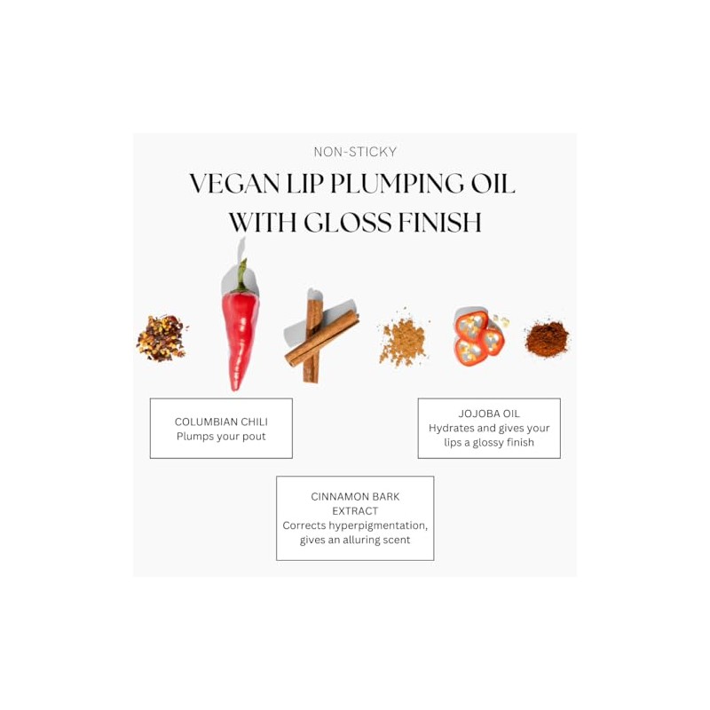 - VEGAN LIP PLUMPER: Formulated using the highest quality ingredients that are naturally derived and non-toxic without any harmful substances. This plumping lip oil serum boosts your lips' natural plumpness for a long-lasting, volumized glossy look all day long.