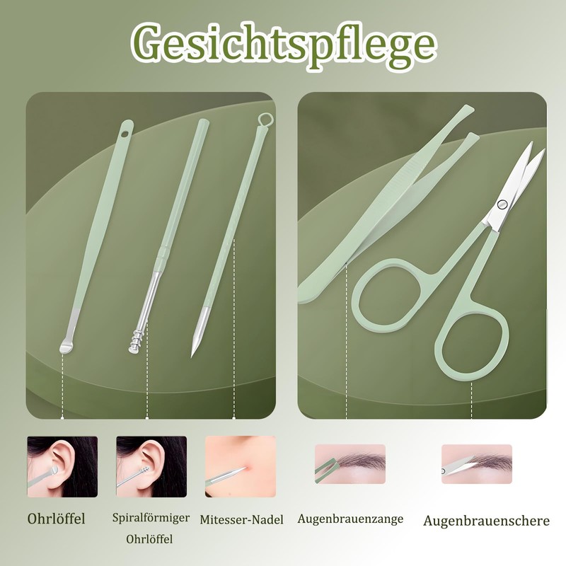 - Multifunktionales 16-in-1 Nagelschere Set: Mehr als nur ein Nagelknipser Kit: Enthält Spezialwerkzeuge wie spiralförmigen Ohrreiniger, Akne-Nadel und Augenbrauenschere. Ermöglicht Salon-Qualität für Maniküre, Pediküre, Augenbrauen- und sogar Ohrenpflege zu Hause.