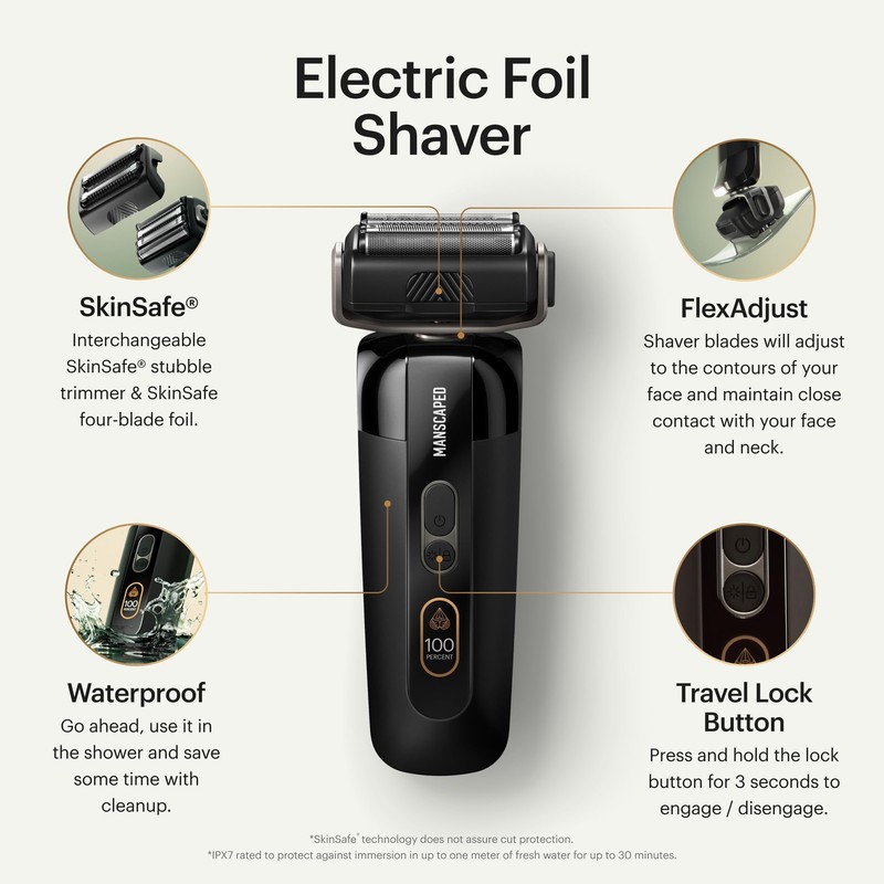 - INTERCHANGEABLE DUAL-HEAD BLADES: If you like a little scruff, keep it tight with the SkinSafe stubble trimmer attachment. For a full refresh, the SkinSafe four-blade foil shaves up to five days of growth down to the skin. The magnetic blade heads are easy to switch out and clean.