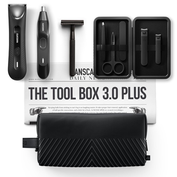MANSCAPED® Tool Box 3.0 Plus with: The Lawn Mower® 3.0 Plus Groin Hair Groomer, Weed Whacker® 2.0 Nose Hair Trimmer, The Plow® 2.0 Razor, The Shears 3.0 Five Piece Nail Kit, The Shed 2.0 Toiletry Bag
