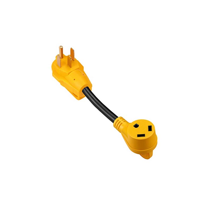 50 AMP Male To 30 AMP Female Ends. 125V/3750 Watt. Designed For Greater Convenience And Ease Of Use.This RV electrical adapter allows you to connect from a 30amp external receptacle at RV Park/Campground to a 50amp service on your RV, It is super-convenient when you are camping or RVING around the countryit fits almost all brands of RV campers and recreational vehicles.Specification:Operating current: 50AMP (TT-30P)Male to 30AMP (14-50R)FemaleVoltage: 125V/3750-WattJacket: PVCWire material: Copper WiringPackage included:1x 30M/50F RV Power Cord Adapter.
