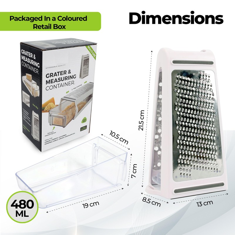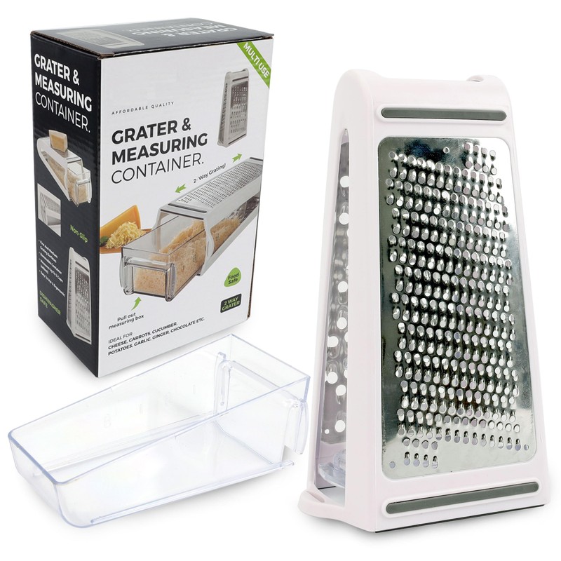 FREE CONTAINER : 480ml measuring storage container with non-slip base to hold your food for mess-free grating – grate directly into the container. The container also has a measuring line for easy and accurate measurements of ingredients which also helps keep your kitchen clean while cooking.