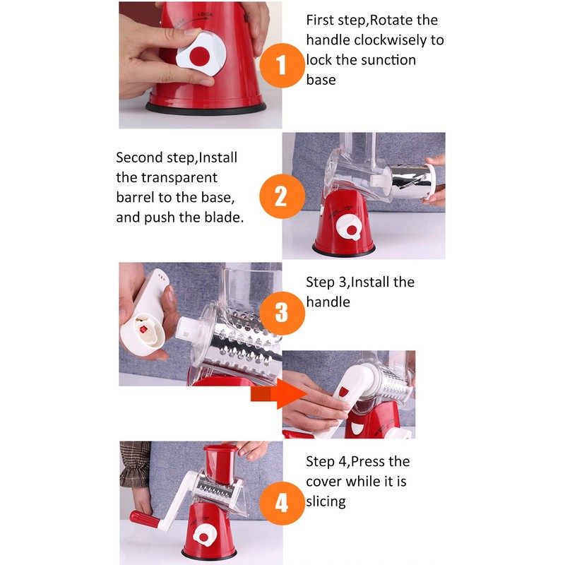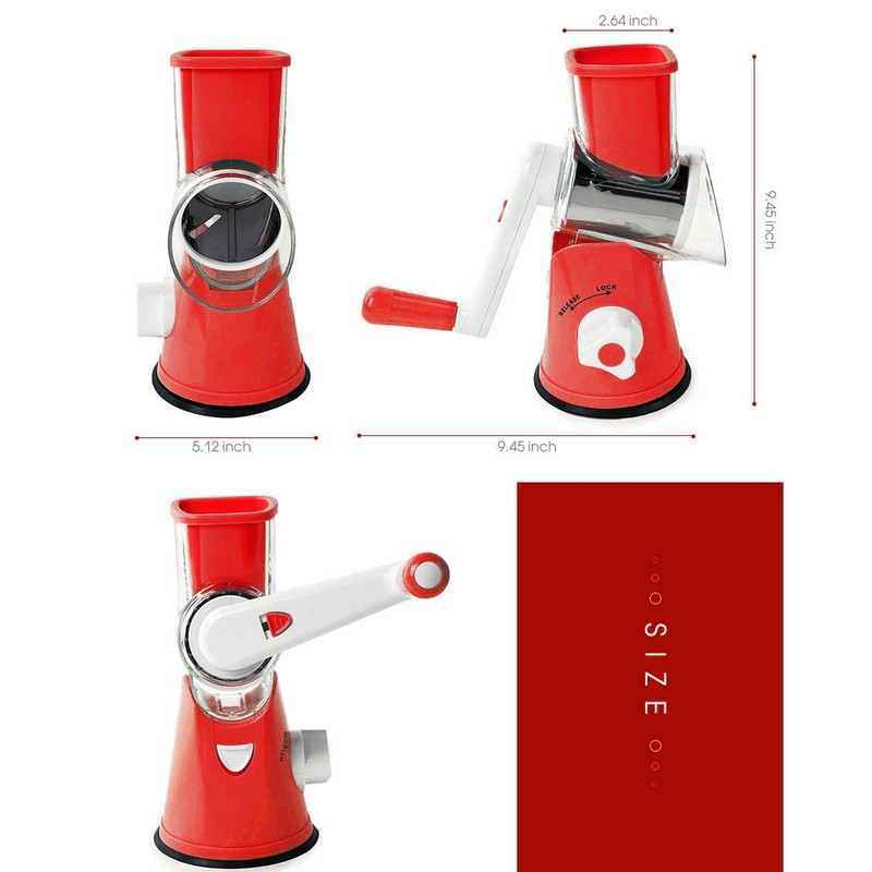 - MULTIFUNCTIONAL:This vegetable grinder has 3 stainless steel drum blades, a slicing blade, a coarse shredding blade and a fine shredding blade.Its perfect for slicing potato,cumumber,shredding cheese,carrot,grinding nut and frozen butter. Shredding cheese is no longer the worst part about making dinner.There is a strong suction base at the bottom of the food shredder slicer. It can lock with no pressure on any flat kitchen surface(wet it with a little water or olive oil can get a better s