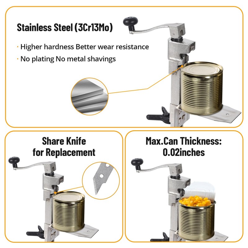 - 【Quick and Efficient Cutting】Experience the ease of opening even the toughest cans with our commercial-grade can opener! Crafted with a stainless steel blade (3Cr13Mo), this tool offers exceptional hardness and wear resistance, ensuring long-lasting performance. Plus, the unplated blade design eliminates the worry of metal shavings contaminating your food. With the ability to open up to 6 cans per minute(Maximum can thickness: 0.02 inches / 0.4 mm).