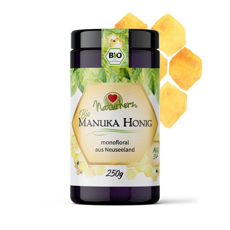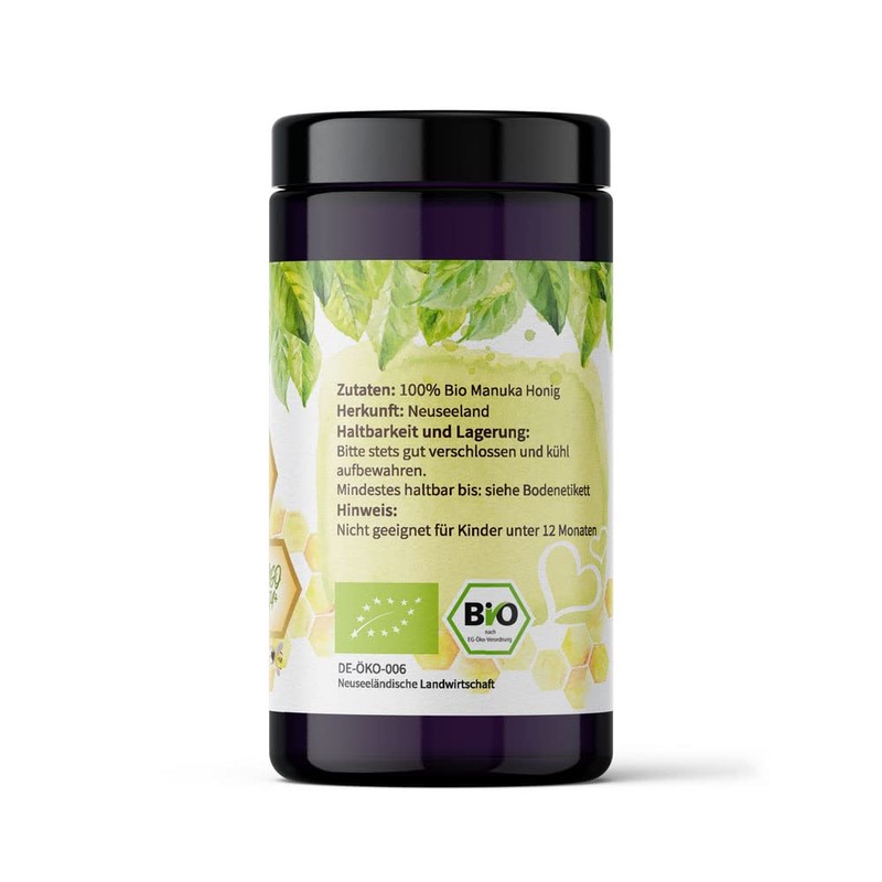Our Manuka honey comes from organic, species-appropriate beekeeping in New Zealand. It impresses with its high methylglyoxal (MGO) value of at least 514 mg/ kg, which is obtained by the unique nectar of the New Zealand South Sea myrtle.